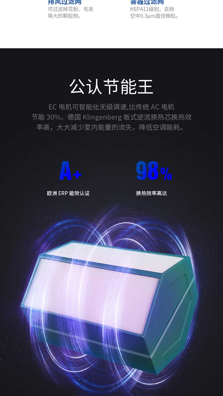 ●風量高達415m3/h,滿足人體每小時30m3新鮮空氣的需求。